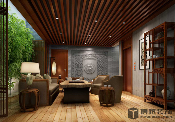 新中式风格以符合现代人的生活习惯的室内居住空间现实舒适的居住生活。在室内色彩方面,本案以红色、暗红、水墨黑和木原色来打造新中式的气氛。家具搭配上主要取材与自然,以木材为主,在合适的地方用合适的材料。在室内绿化上以竹子为主,竹子自古以来就是文人墨客所歌颂的主题之一,节气风度的代表,刚直不阿。也是中国传统文化之精髓。