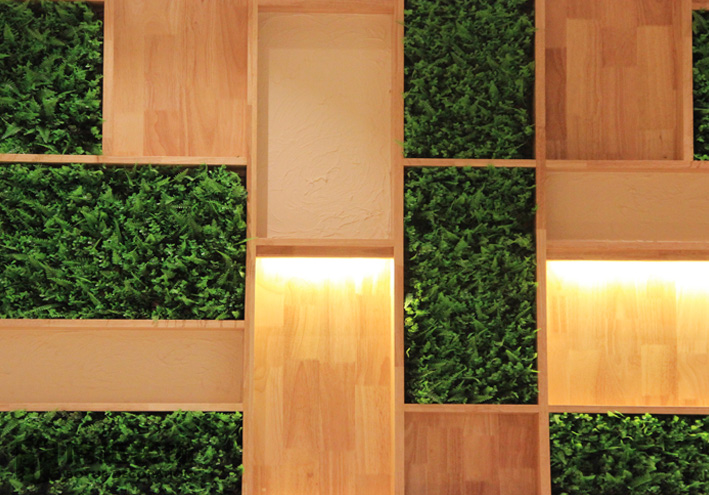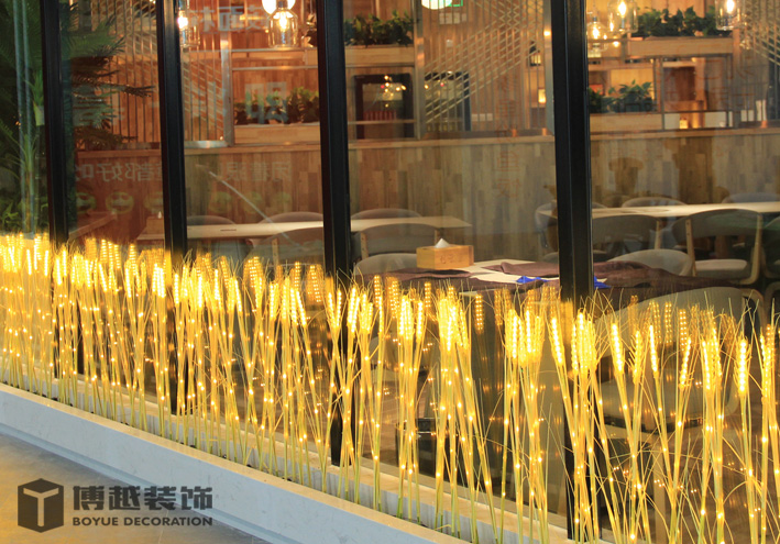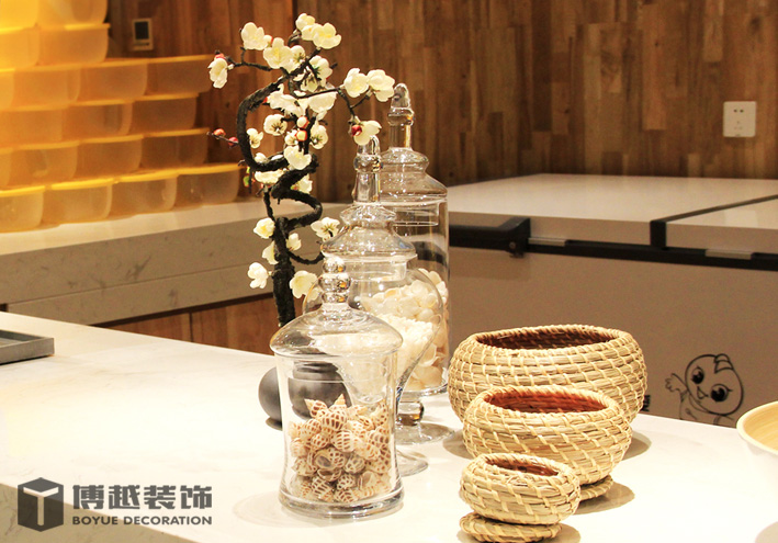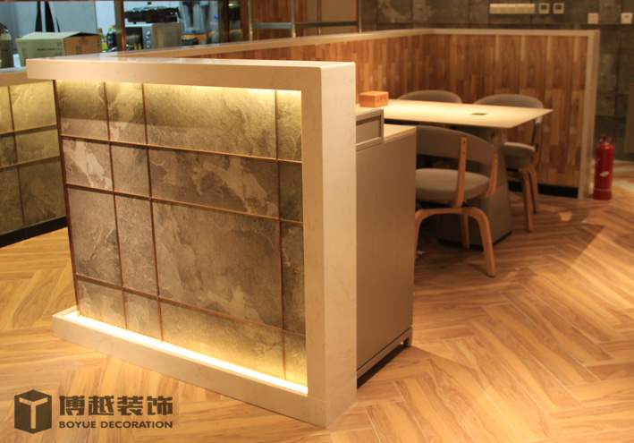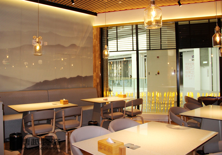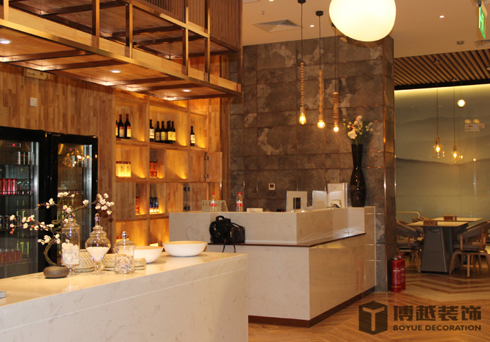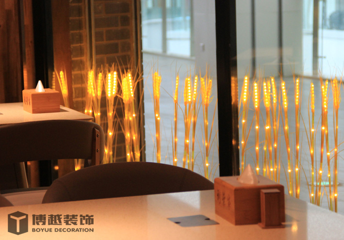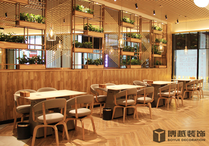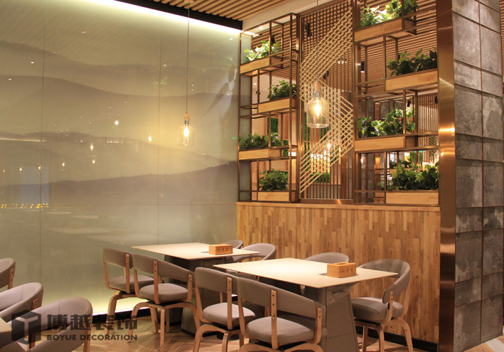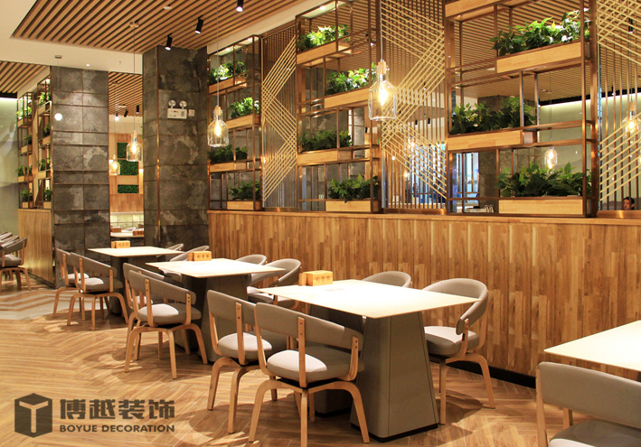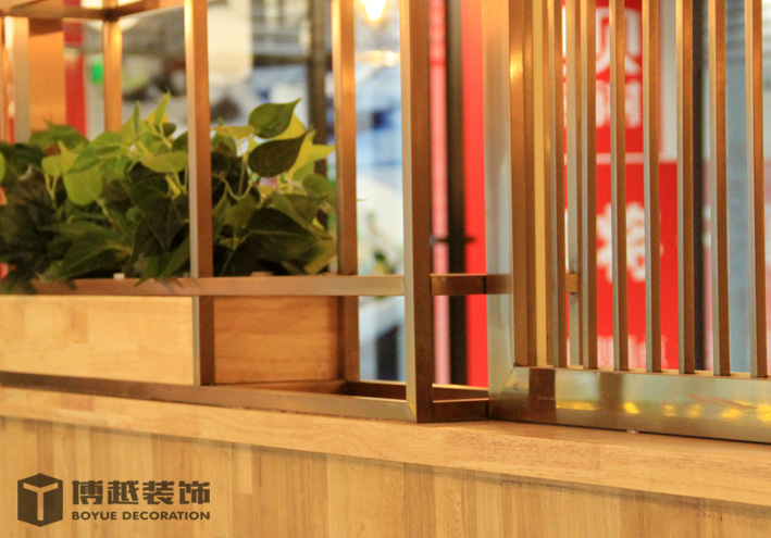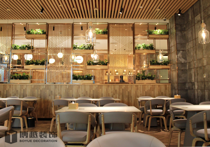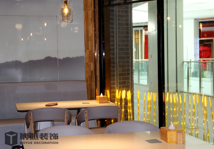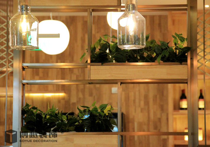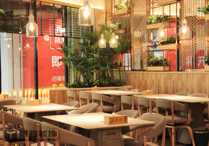 现代感极强的餐饮空间,地面的铺装使整个空间更加时尚,有调调,尤其木色与白色之间的跳色更灵动活泼。顶面的滑轨射灯设计我觉得很科学,可以根据需求将其随意滑动,调制适应的位置,而且光不够可以随意增加,而独立安装的射灯恐怕就没有这么便捷的了,暖暖的光源照在美美的小龙虾上面,吃货们应该更有食欲吧。门头内侧的灯带时候来深化时增加的,这条光加的真的很好,使明明暗淡又简单的白色乳胶漆墙面有虚实的变化,也使整个空间的光线更加的温馨明亮。绿植的确是个美化环境的最佳配饰,整个空间有绿植的衬托更加生动有色彩。